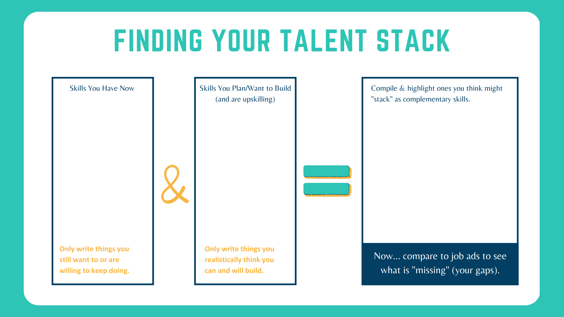 Homework: Take an inventory of the skills you already have and could put on a resume, plan for the skills you intend to build or are already actively upskilling, research job ads, and begin to build a “Talent Stack” of your own complementary skills.